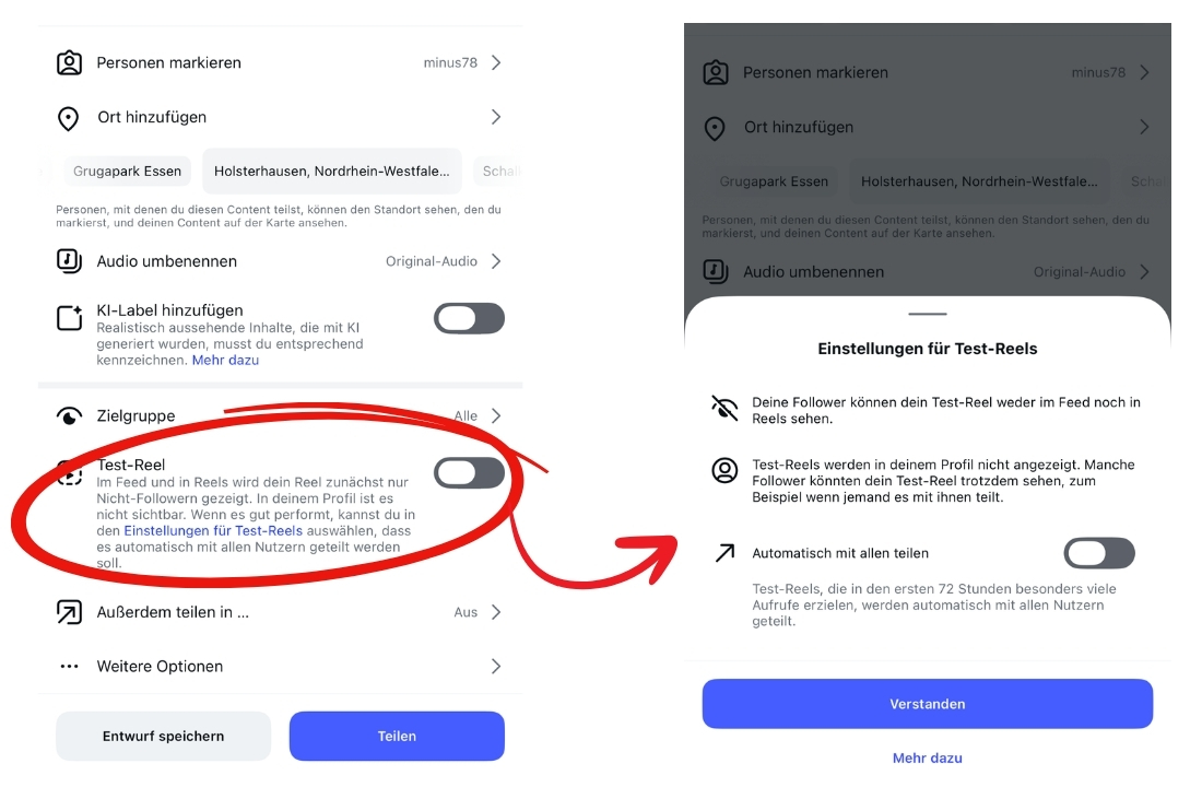 Trial Reels werden ausschließlich Nicht-Followern gezeigt. Sie erscheinen nicht in eurem Profil-Grid, Reels-Tab oder im Feed eurer Follows – nur ihr selbst seht sie im Entwürfe-Bereich.